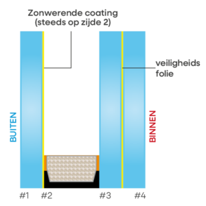 Bij zonwerende beglazing in een woning - waar gelaagd glas vaak vereist is aan de binnenzijde - wordt de zonwerende coating doorgaans aangebracht op positie 2 (de binnenzijde van de buitenruit), terwijl de binnenruit gelaagd is.